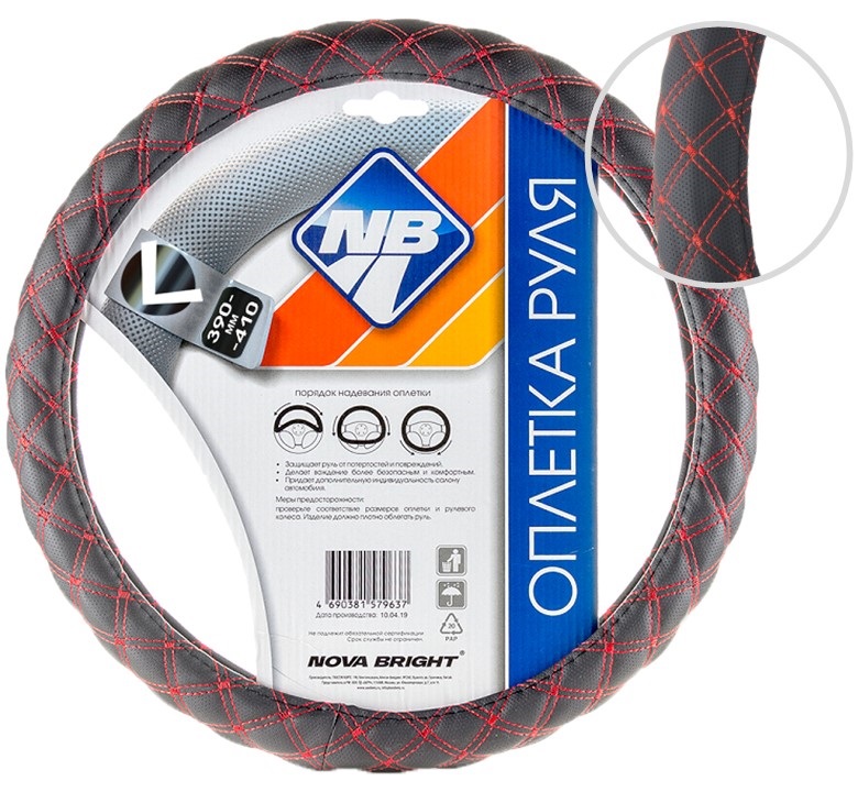 Оплетка рулевого колеса "Nova Bright" (L) экокожа, черная с красной прострочкой ромбиками