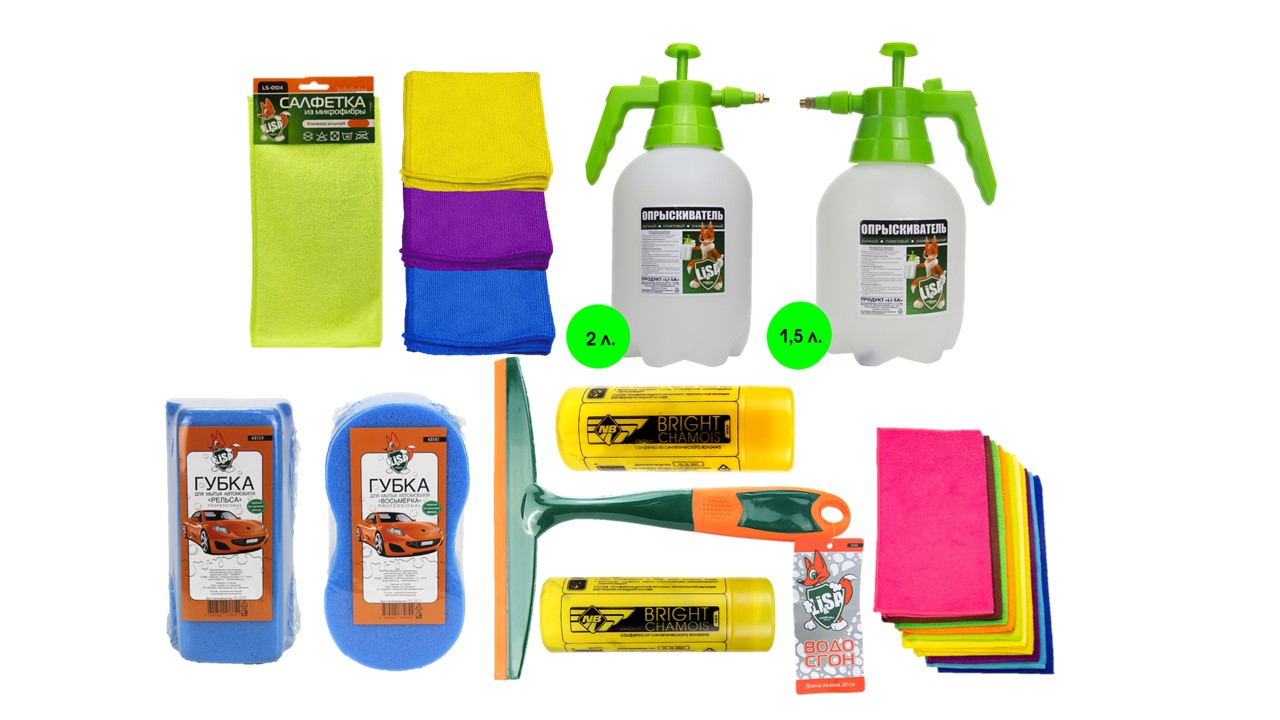 Салфетки, водосгоны, губки, ведра, опрыскиватели